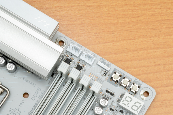 PCIe5.0×4対応スロットには、大型のM.2ヒートシンクを装備する。高発熱なPCIe5.0×4 SSDではエアフローが必要になるが、フィン構造で高い冷却効果に期待できる