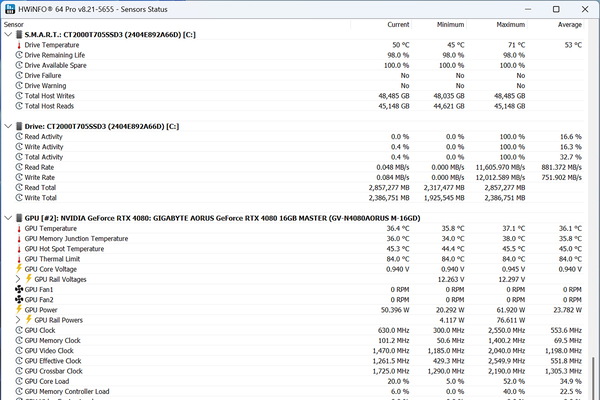 スコアはCrucial「T705 2TB」モデルの公称値となるシーケンシャルリード1万4500MB/秒、同ライト1万2700MB/秒には届かなかったが、PCIe5.0×4 SSDらしく、1万MB/秒超えのパフォーマンスを発揮している。高速な分、高発熱なPCIe5.0×4 SSDだが、ベンチマーク中の温度は71度となっていた。バラックケース(低い室温)、空冷CPUクーラーといった環境なので、余裕がある温度とは言えないが、ケース内エアフローのある環境なら問題ないだろう。