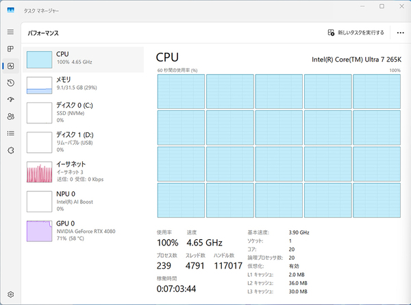 CPUとGPUに100%の負荷をかけ、システム全体の消費電力は690~700W台に達していた。「VRM MOS」の温度は、「モンスターハンターワイルズ」ベンチマークを1時間連続実行時よりも大きく上昇したが、それでも59度と不安を覚えることのない温度となっていた。