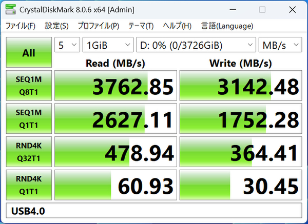 スコアはシーケンシャルリードが3700MB/秒、同ライトが3100MB/秒と外付けストレージ最速クラスの読み書き速度となった。USB4対応デバイスはまだまだ少ないが、このマザーならばUSB4のパフォーマンスを存分に発揮できる。
