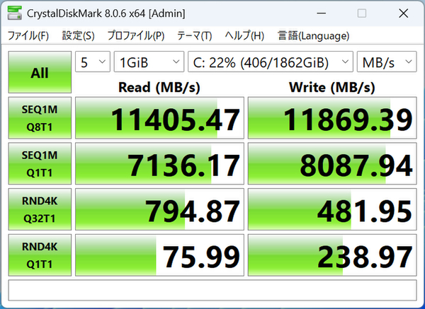 PCIe5.0×4 NVMe M.2 SSDのCrucial「T705」を組み合わせたので、そのパフォーマンスを「CrystalDiskMark 8.0.4」でチェックした。テストに使用したのは、容量2TBモデルだがOSやゲーム、各種アプリをセットアップしているため、406GB使用している状態で計測している。