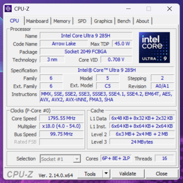 Core Ultra 9 285HはCore Ultra 200Hシリーズの最上位。Pコア6基、Eコア8基、LP Eコアが2基の合計16コア/16スレッド構成になります。なお、Processor Base Power(以下、PBP)の45W、Maximum Turbo Power(以下、MTP)の115WはCore Ultra 9 285Hのみの特別仕様です