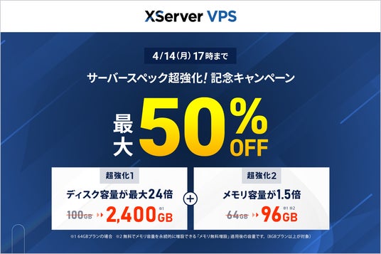 エックスサーバー株式会社(所在地:大阪市北区、代表取締役:小林 尚希)は、サーバー性能とコストパフォーマンスでNo.1(※1)を誇る『XServer VPS』の提供スペックを、2025年2月3日に大幅に強化しました。今回の強化では、4GBプラン以上で一律100GBだったNVMe SSDのディスク容量を最大2,400GBまで拡大。さらに8GBプラン以上では、メモリ容量を無料で1.5倍に増設できる「メモリ無料増設」機能を新たに追加しました。また、今回のスペック強化を記念して、2025年2月10日から「サーバースペック超強化!記念キャンペーン」を開催します。