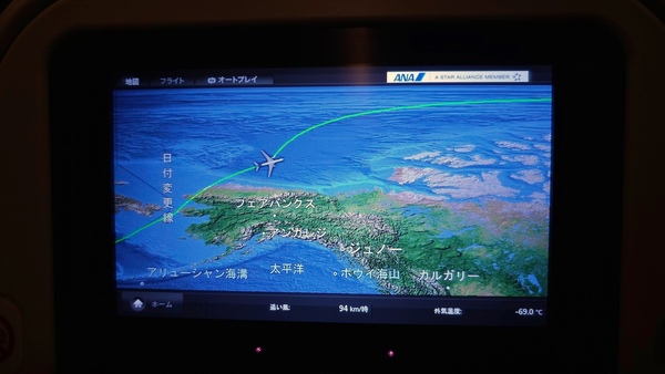 欧州行きは北回りを使うケースが多く、今回もアラスカ方面へ抜けたあとグリーンランド上空を通ってスカンジナビア半島へと向かうルートでした。
