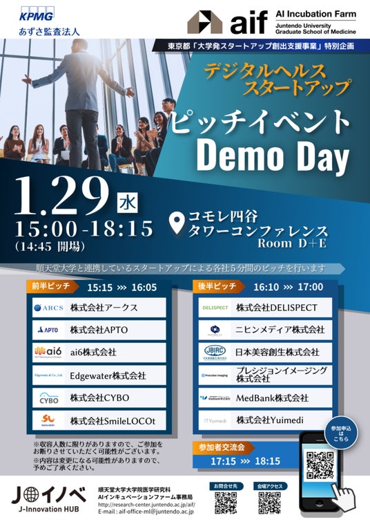 本イベントは、順天堂大学AIインキュベーションファーム(aif)とKPMGジャパンの共催により、デジタルヘルス分野の有望なスタートアップ企業が事業紹介を行う場として開催されました。