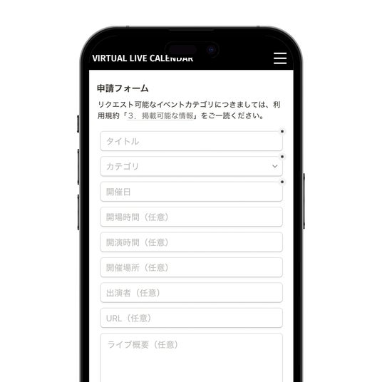 本サービスは、アカウント登録不要・無料で、誰でも自由にバーチャルアーティストのライブやイベント情報を「投稿」することが可能な「アーティストとファンが一緒につくるWEBカレンダー」です。