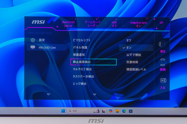 OSDの操作は、スティックタイプのナビキーをセンター下部に備えている。OSDの表示もセンター下部になっているが、基本的な設定はGaming Intelligenceアプリから操作ができるため、頻繁に利用するのは入力の切り替えくらいだろう。まだ、壁紙やタスクバーなど動きのない映像による焼付きを防止する「MSI OLED Care 2.0」機能が搭載されている。一定の時間が経つと輝度の軽減や、ピクセルシフトやパネル保護などの設定が可能だ。