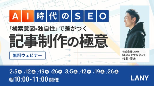 デジタルマーケティング支援を行う株式会社LANY(東京都渋谷区、代表取締役社長:竹内渓太)は、【無料ウェビナー】AI時代のSEO 「検索意図×独自性」で差がつく記事制作の極意を3/26(水)まで複数日程開催いたします。