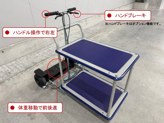 (※)オプション扱いの「ハンドブレーキ」は、どなたでも安全、確実に停止させることができ、自転車タイプのように、ハンドルにつけることはもちろん、台車の持ち手部分に取り付けることも可能です。