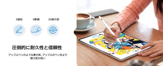 JAMJAKEのiPad用タッチペンは、精度、感度、耐久性が大幅に向上し、従来品で見られた遅延や途切れを完全に解消。まるでアップルペンシルのような書き心地で、書きたい時に即座に反応します。また、耐久性はアップルペン先を上回る高性能を誇り、長時間使っても劣化しません。