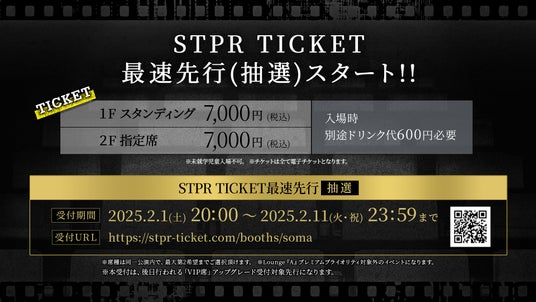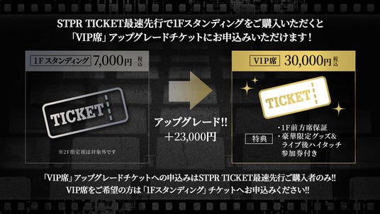 ・STPR TICKET最速先行(抽選)で「1Fスタンディング」チケットをご購入された方は、後日VIP席へのアップグレード受付(抽選)にお申込みいただけます。