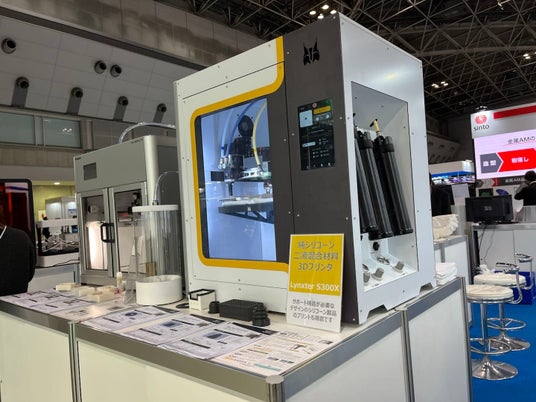 シリコーン製品はその加工の難しさから、「型」を用いて製造する方法が一般的です。二液性シリコーンの利用が可能な液体/ペースト3Dプリンタ Lynxter S300X を活用することにより、純シリコーン性の製品をダイレクトに製造することができます。このソリューションにはご来場のお客様に新たな製造方法のヒントとなり、数多くのご質問や検証のご依頼を頂きました。