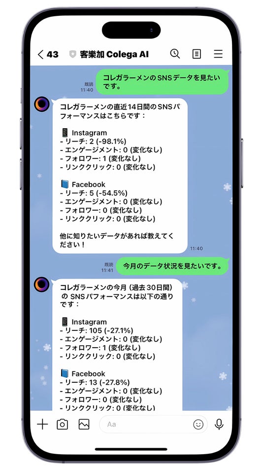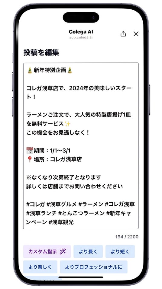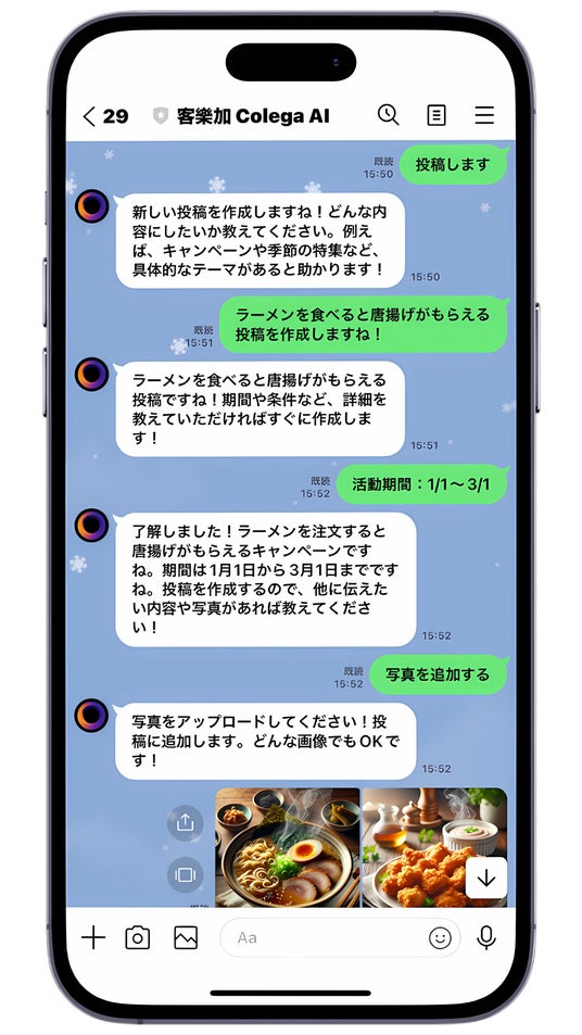さらに、今春にリリースを予定している日本向けサービスの本導入に先立ち、LINEで簡単にAIが飲食店向けのSNSコンテンツを作成、投稿、分析する「Colega AI」を2ヶ月無償でご活用頂けるトライアル店舗の募集を開始したことも併せて発表致します。