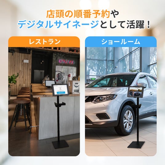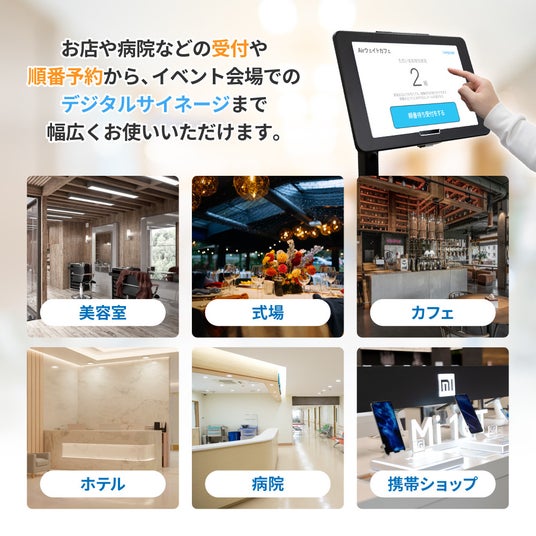 店頭での順番予約に最適従来の用紙に記入するタイプの順番待ちから、iPadを使ったスマートな順番待ち環境をかんたんに構築することができるスタンドです。フロア設置タイプのiPadスタンドは無人受付による業務効率化に加え、卓上型と比べて遠目からでもお客様が視認しやすいメリットがあります。