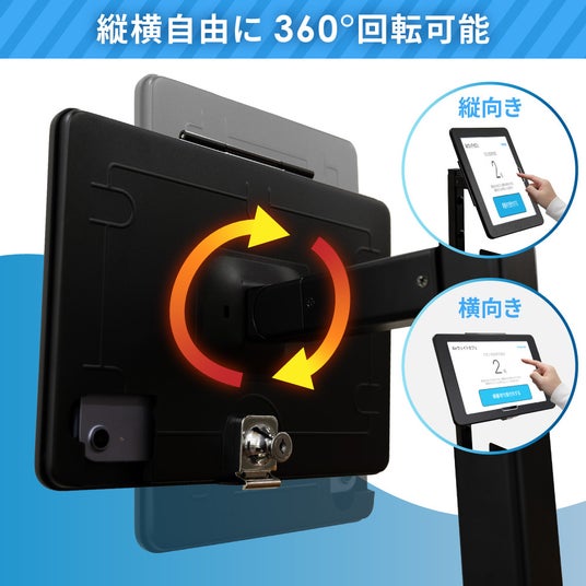 細かい角度調整や回転が可能お客様の目線に合わせてiPadの向きや角度を自由に調節できます。iPadホルダー部分を回転すれば縦長・横長のコンテンツ両方に対応可能です。