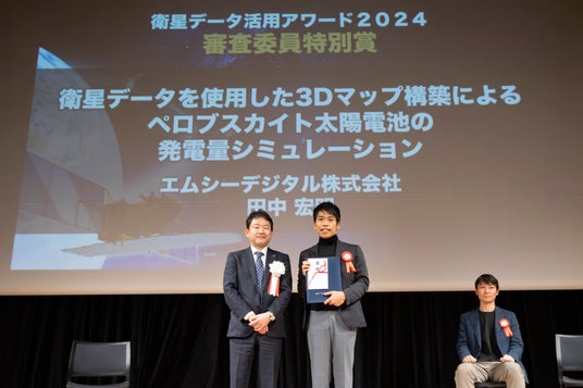 テクノロジーをもって企業の課題解決を支援するエムシーデジタル株式会社(本社:東京都千代田区、代表取締役社長:河内 伸学)が、宇宙サービスイノベーションラボ事業協同組合(所在:東京都中央区、代表理事:神武 直彦)およびNTTコミュニケーションズ株式会社(本社:東京都千代田区、代表取締役社長:小島 克重)が主催する「衛星データ活用アワード2024」において、審査委員特別賞を受賞したことをお知らせいたします。当社のアイデア「衛星データを使用した3Dマップ構築によるペロブスカイト太陽電池の発電量シミュレーション」が高く評価され、今回の受賞に至りました。