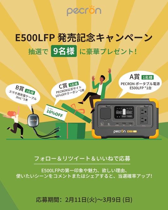 PECRON JAPANは、PECRON公式X (旧Twitter)アカウント、PECRON公式Instagramアカウントにて【PECRON E500LFP発売記念キャンペーン】も同時に開催します。ご応募いただいた方の中から抽選で合計18名様に、豪華賞品をプレゼントいたします。詳細は公式サイト、または公式Twitterアカウント、公式Instagramアカウントにてご確認ください。