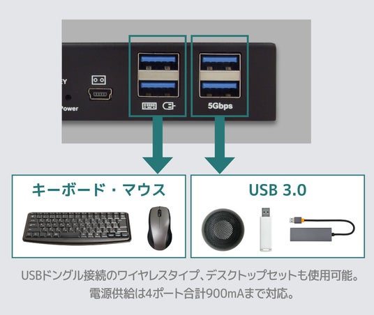 バスパワーで動作するUSB機器も接続可能で、USBメモリー、USBスピーカーマイク、USBカードリーダーなどを一時的に使用する際に便利です。 また、USBドングル接続タイプのワイヤレスキーボードやマウス、デスクトップセットにも対応しています。