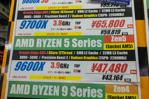 そしてCPUも最新の「Ryzen 5 9600X」と同じ6コア/12スレッドで、パフォーマンスが大きく違わない「Ryzen 5 7600X」が、3万7000円前後と手ごろな価格になっている。