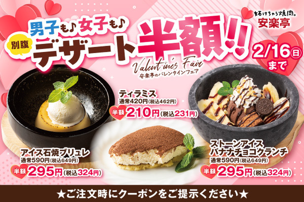安楽亭は2月11日~2月16日の6日間、デザート3種類を半額で提供するキャンペーンを実施中。