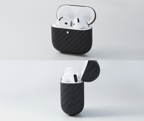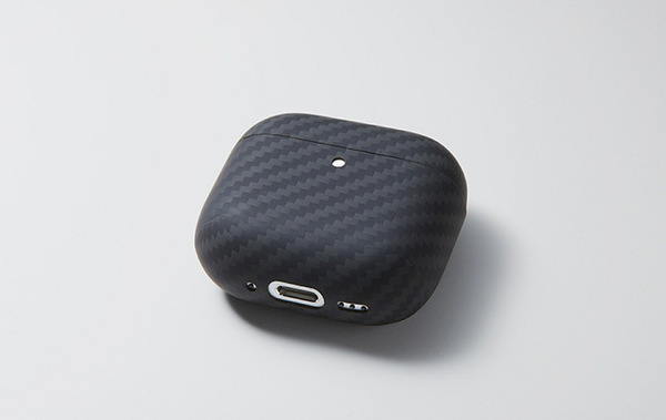 アラミド繊維の一種であるケブラーを使用した3D特殊成形により、AirPods 4にほぼ完璧にフィットする専用ケースです。厚み0.65mmと重量5gを実現し、初めて装着した時にその軽さと薄さに驚くことでしょう。このケースは、ドライカーボンファイバーに似た工法で製造され、耐衝撃性能も高めています。