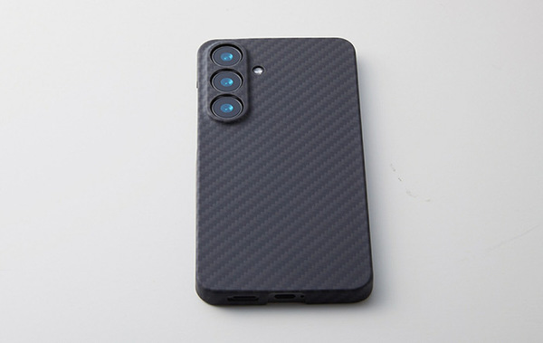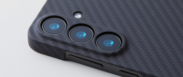ケースはアラミド繊維による一体成形で、高い一体感を実現。ボタン操作やUSBコネクター接続がスムーズで、カメラレンズも保護されています。