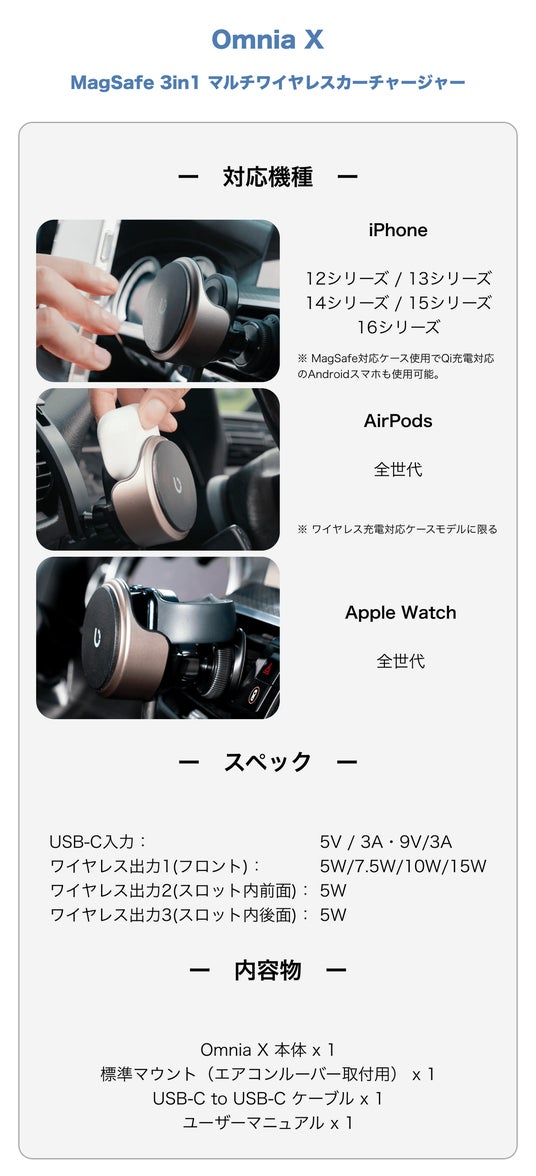 「Omnia X」 MagSafe 3in1 マルチワイヤレスカーチャージャーの最大の特徴はiPhone + AirPods、iPhone + Apple Watchの組み合わせで、携帯とアクセサリーを2台同時にワイヤレスで充電できること。車に乗り込んでからケーブルを探して抜き差しする手間がなく、スマートに愛用デバイスを充電することができます。iPhoneの15W急速充電にも対応。充電が遅い、ケーブルがごちゃごちゃしているなどの煩わしさもなくなり、より快適なドライビングタイムが過ごせる唯一無二の車載充電器です。MagSafe対応のケースを使用することでAndroidユーザーも使用可能です。