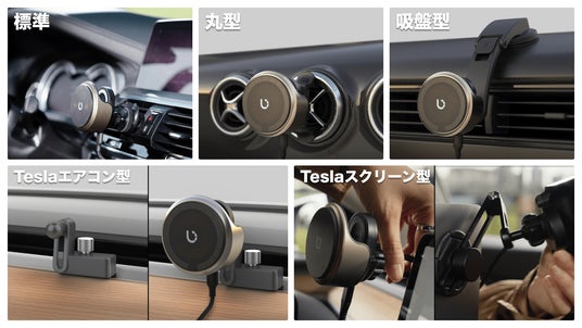 Omnia Xに付属している標準マウントはエアコン吹き出し口のルーバーに取り付けるマウントです。吹き出し口に差し込み、ダイアルを回転させるだけでしっかりとルーバーをキャッチ。取り付けの手軽さだけでなく、取付後の角度調整も自由自在に。誰もが「Omnia X」を楽しめるように、標準マウントの他に4種類のオプションマウント(別売)を準備。軽自動車からワンボックスカー、ヴィンテージカーからTeslaなどの最新電気自動車まで、どんな車にも快適ドライビング空間を提供します。