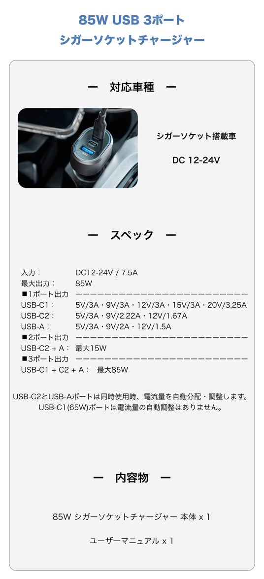 【85W USB 3ポート シガーソケットチャージャー】 定価:3,960(税込)