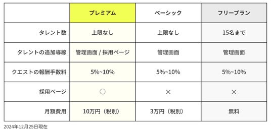 フリープランは、タレント数15名までは、ずっと無料でお使い頂けます。