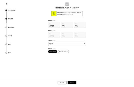 企業とスポット的につながりたいタレント向けに案件(クエスト)を作成できます。