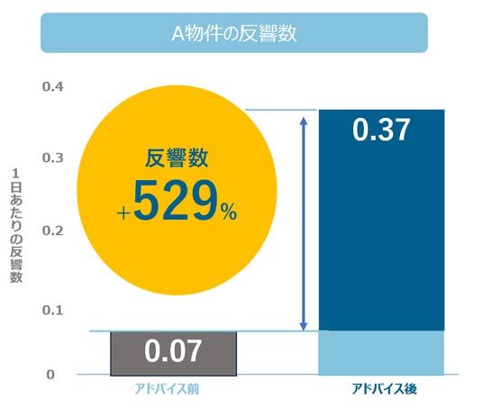 A物件では利用前はほとんど反響が得られていませんでしたが、利用後には1日あたりの反響数が0.37件まで向上し、改善率529%を達成。