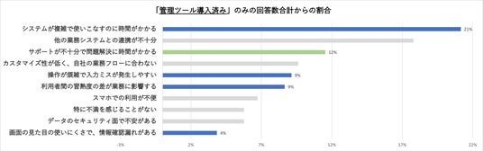 当社の調べでは「質問:修繕や施工の進捗管理についてツール導入有無によって不満に感じること」という問い対して、「管理ツール導入済み」にもかかわらず、不満がある方の43%がシステムの複雑性に起因した不満を持っている(青色の棒グラフの合計)ことがわかっています。