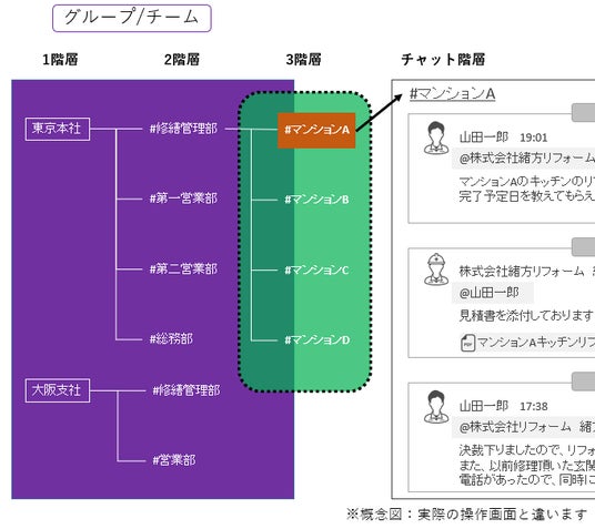 グループやチームなどの階層が1つではなく、階層の下に階層を無限に増やせる仕様のため、細かく階層構造でグループ分けし修繕・施工の進捗管理ができるため、他の現場とのコミュニケーションと混ざらず、どこにどんな業務があるか探しやすくなります。また、自社の運用に合う細かい管理が可能になります。