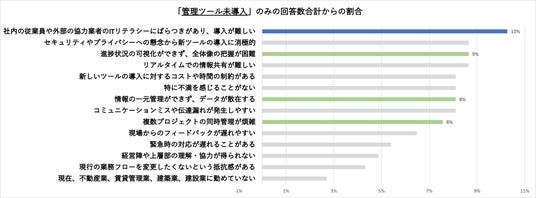 その他、「管理ツール未導入」で進捗管理に不満がある方の9%が業務の全体像の把握が困難で、8%が情報管理の一元化ができておらず、8%が複数プロジェクトの同時管理が煩雑に感じており、現場の全体像を可視化をしつつ、複数の現場が同時に進行している状況でも抜け漏れなく管理でき、現場ごとの情報を個別に管理できるツールが求められています。