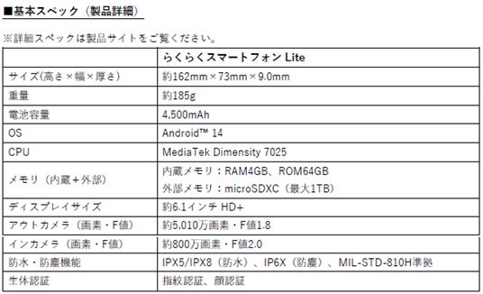 ・「らくらくスマートフォン Lite MR01」製品ページ