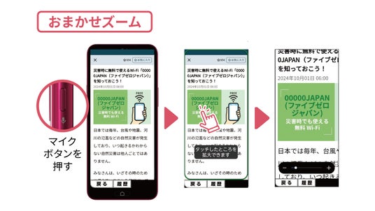 またマイクボタンを押すことで、見づらい画面や文字を簡単に拡大できる「おまかせズーム機能」を搭載しています。