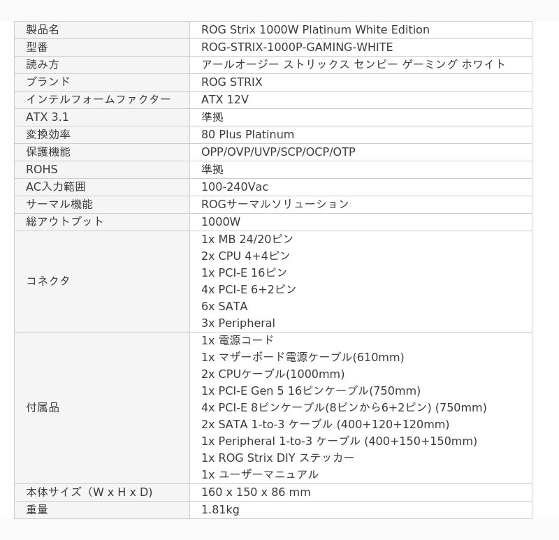次世代GaN MOSFETとインテリジェントな電圧スタビライザー採用、80 PLUS(R) Platinum認証の電源、ROG Strix 1000W Platinum White Editionを発表