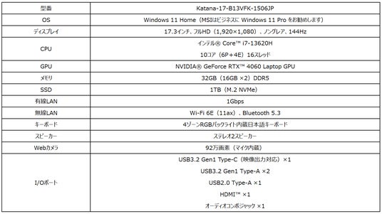 【Katana-17-B13VFK-1506JPの主な特徴】
