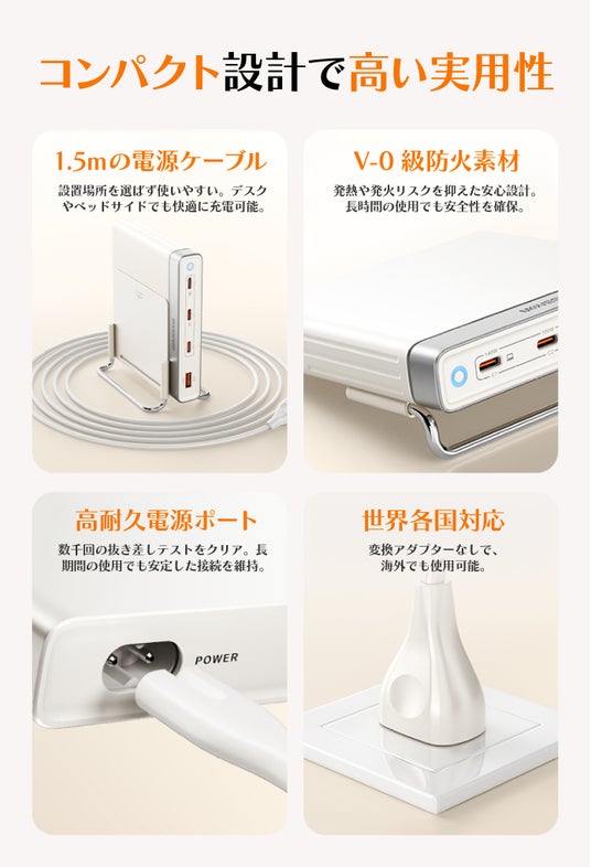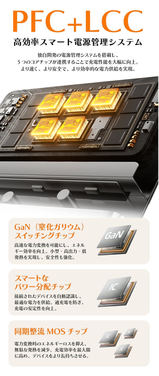 最新技術「GaN」(窒化ガリウム)を採用し、驚くほどコンパクトながらもハイパワーな充電性能を実現しました。