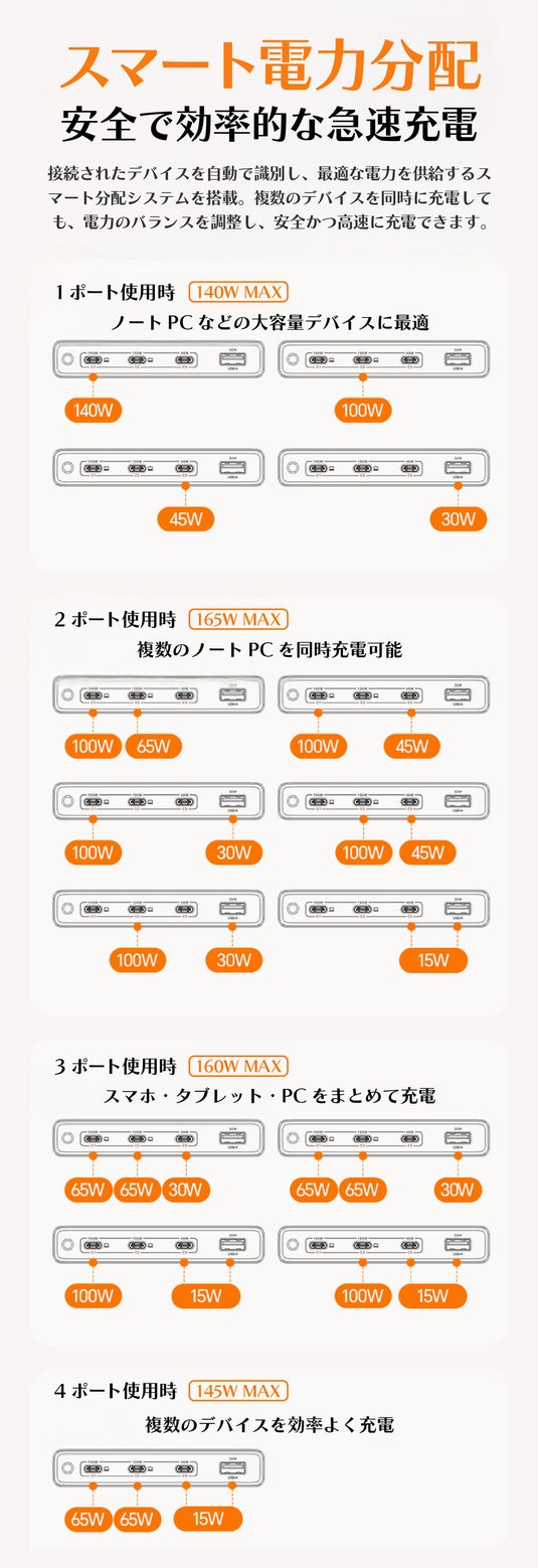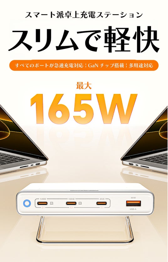 ・最大165Wの高出力で、ノートPCやスマホを同時に急速充電可能!