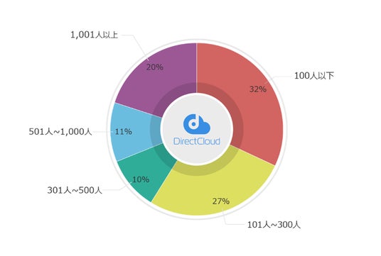 DirectCloudの利用企業の従業員規模は、100人以下(32%)、101人~300人(27%)、301人~500人(10%)、501人~1,000人(11%)、1,001人以上(20%)と幅広い規模の企業に導入されています。