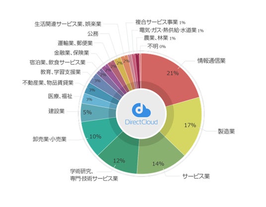 DirectCloudは、情報通信業(21%)、製造業(17%)、サービス業(14%)、学術研究・専門・技術サービス業(12%)、卸売業・小売業(10%)など、さまざまな業種でご利用いただいています。