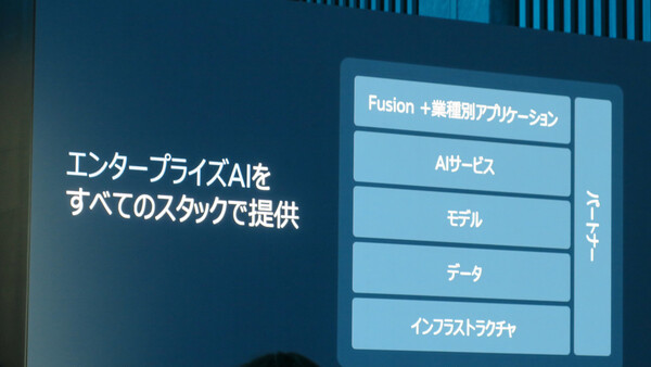 エバンス氏は、「OracleのAIへのアプローチにおいてユニークな点は、堅牢なインフラからデータ、モデル、幅広いスマートアプリケーションスイートまで、すべての要素にAIが組み込まれている」点だとする。その一例として、日本でも前日に発表されたFusion ApplicationsのAIエージェントでは「複雑なタスクを処理し、より少ないリソースでより多くのことが実現できる」と語った。