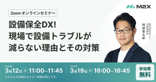 株式会社M2X(本社:東京都中央区、代表取締役:岡部晋太郎)(以下「当社」)は、「設備保全DX!現場で設備トラブルが減らない理由とその対策」をテーマとした無料オンラインセミナーを開催致します。