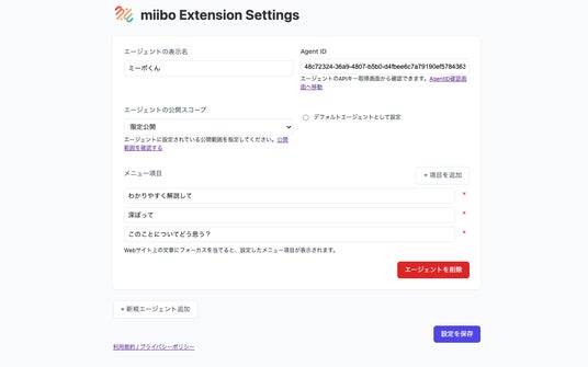 ※本拡張機能の利用にはmiibo AI エージェントの作成が必要です。