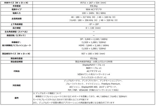 「MAG 321CUPDF」は4K / 160Hz・フルHD / 320Hzの2つのモードを素早く切り替え可能な「デュアルモード」を搭載し、高精細な映像を楽しむRPGやスピード重視のFPSなどプレイするゲームジャンルに応じて解像度・リフレッシュレートを臨機応変に切り替え可能です。肉眼に近い1,500Rの湾曲パネルと31.5インチの大画面の組み合わせにより、包み込まれるような高い没入感が特徴で、引き締まった黒を表現可能な高いコントラスト比と高速応答を実現したRAPID VAパネルを搭載し、高いゲーミングスペックかつ高画質と高い没入感を両立したゲーム体験を楽しめます。画面の表示領域を24.5インチ・27インチ相当の表示領域に切り替えるディスプレイサイズエミュレート機能、映像シーンに合わせて画面の明るさ・コントラスト・彩度を自動で調整するAIビジョン、リアルな映像表現が可能なDisplayHDR 400、同期機能としてFreeSync Premiumに対応し、思う存分ゲームプレイを楽しむことができます。また、モニターアームなどに取り付け可能なVESA規格にも対応しています。
