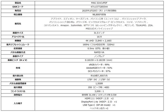 ■ MAG 321CUPDF製品ページ:https://jp.msi.com/Monitor/MAG-321CUPDF