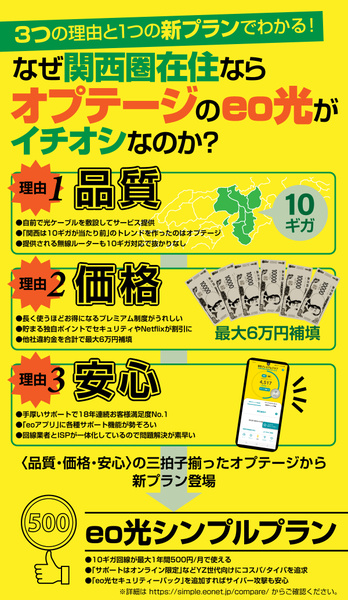 ここまで解説してきたように、〈品質・価格・安心〉の3点を高レベルで備えたオプテージの「eo光」。特にeo光シンプルプランについては、関西圏の戸建て住まいでネット回線を求めているユーザーなら「選ばない理由がない」と言えるだろう。