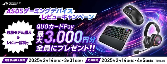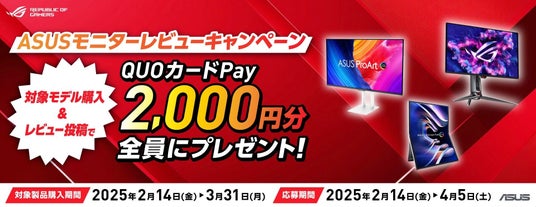 ASUS JAPAN株式会社はASUSのモニターやゲーミングデバイスを購入して、レビューを投稿すると最大3,000円のQUOカードPayがもらえるキャンペーンを発表しました。